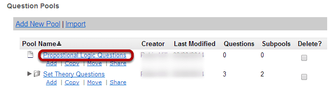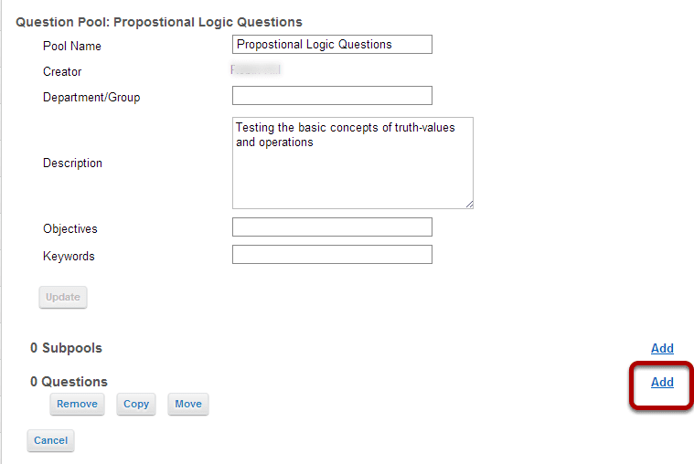 You will see the question pool details, and links for adding subpools and questions. In the Questions section, click the Add link on the right hand side of the screen.