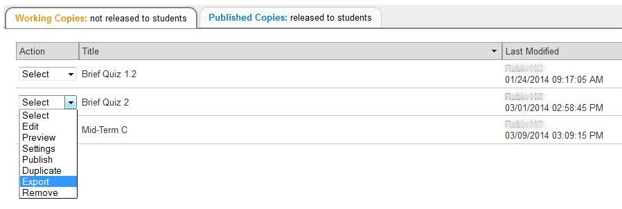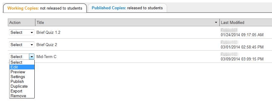 In the lower area of Tests & Quizzes, you will see a new assessment. (It will have the title of the downloaded assessment, not a title from your external file name.) You may now edit the assessment questions, or select Settings to change the title and other settings.