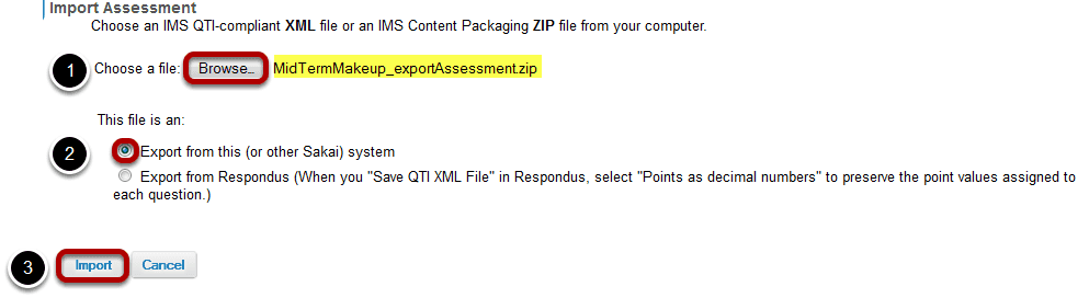 2. Click the radio button indicating its source for correct processing. (Tests & Quizzes supports files saved in QTI format.)